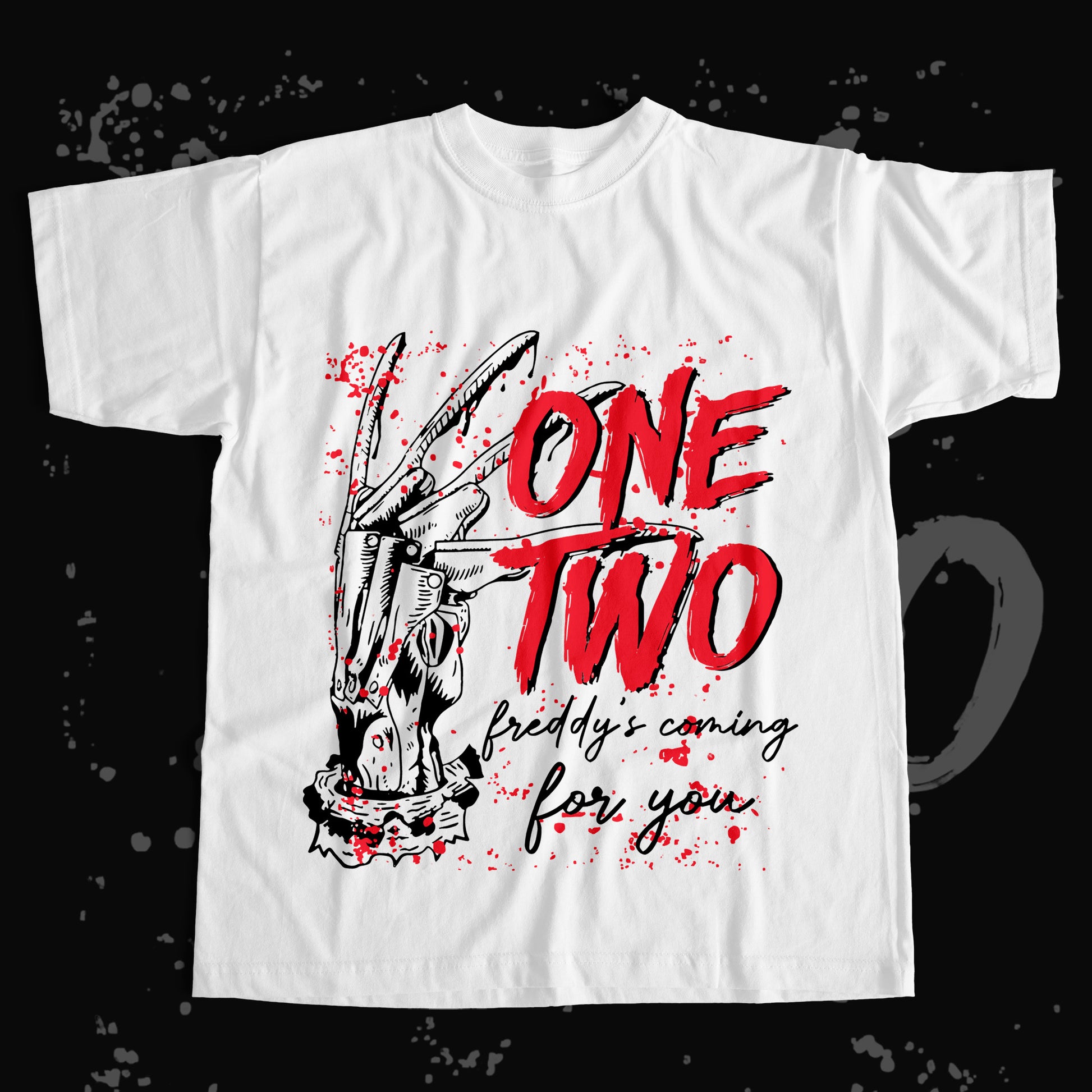Description: Freddy’s iconic line reimagined with blood splatters and bold typography for nightmare lovers.