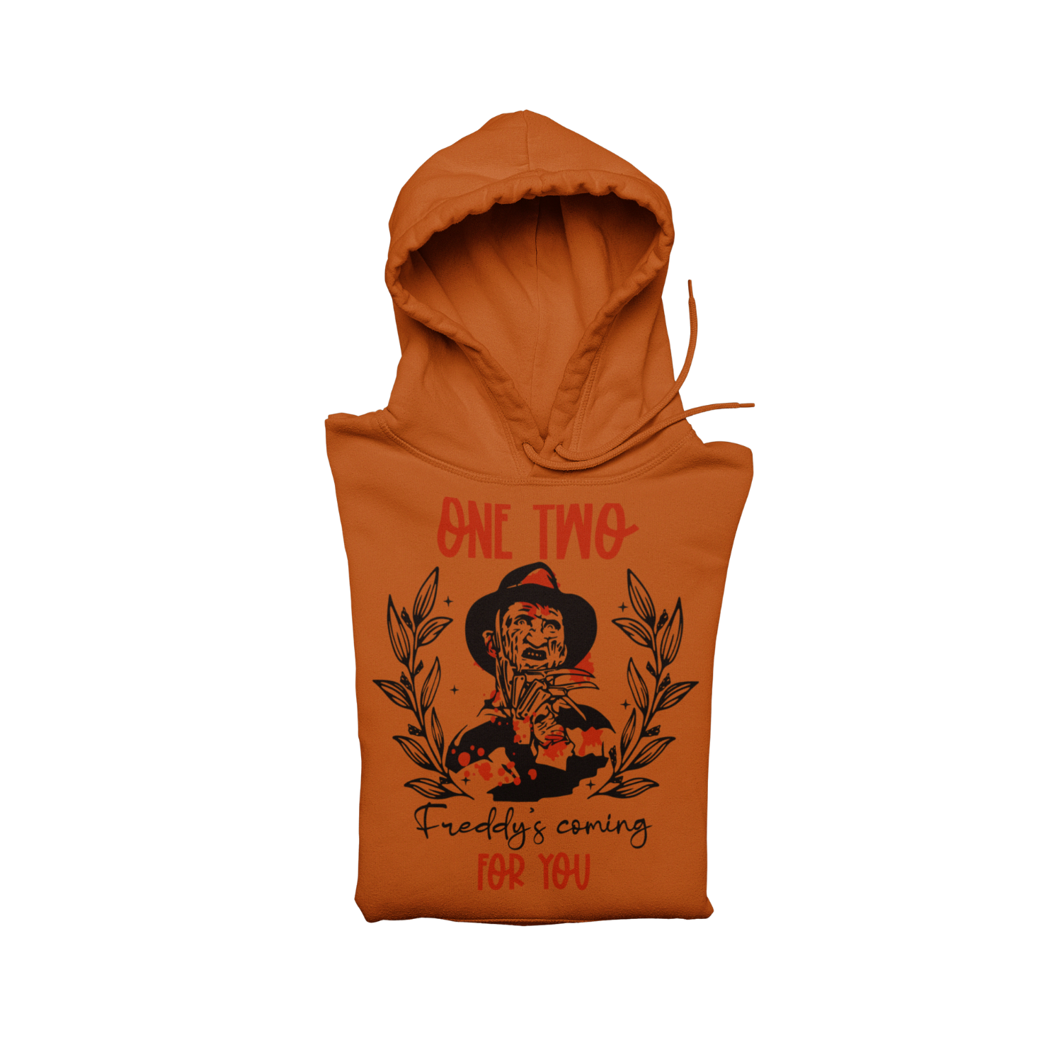 One Two, Freddy’s Coming For You Pullover Hoodie – Orange